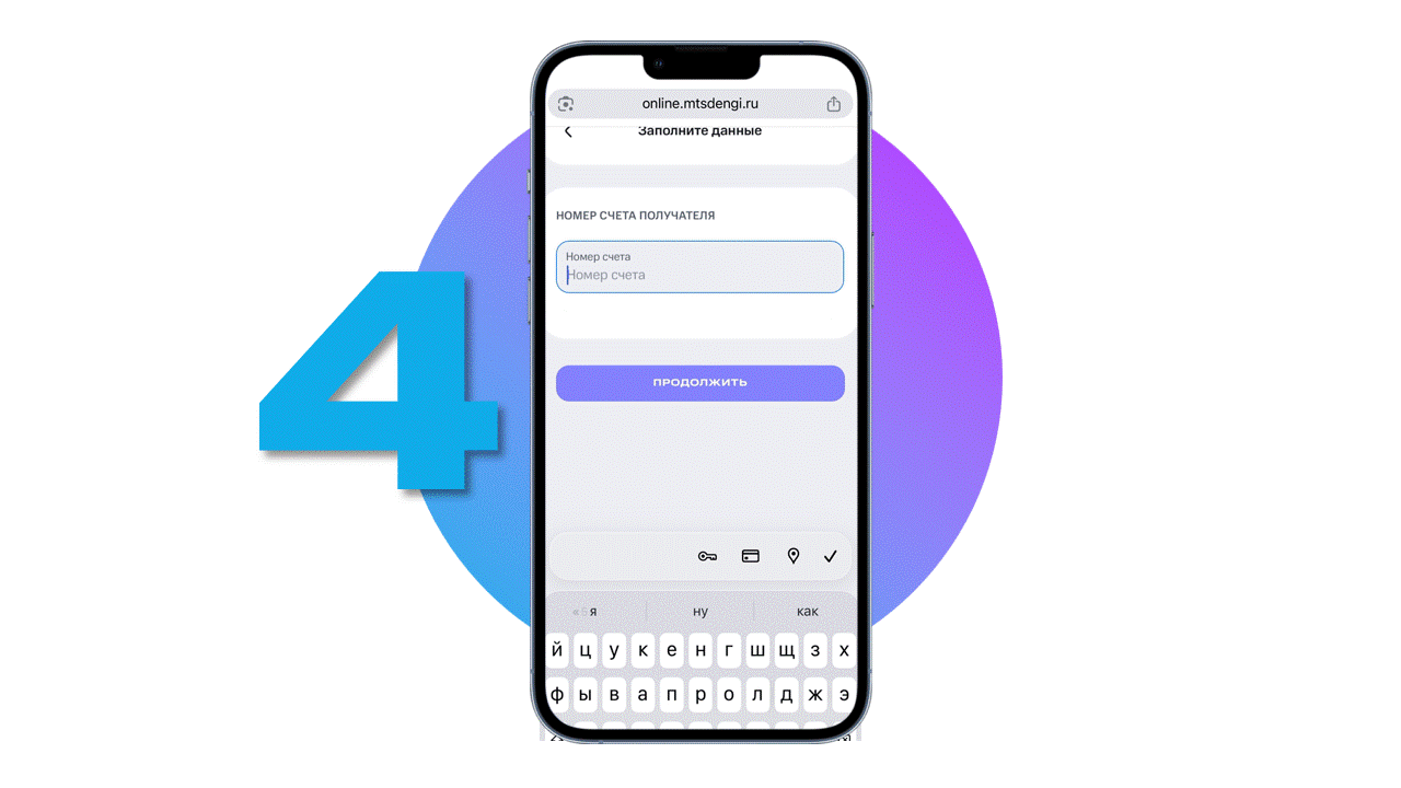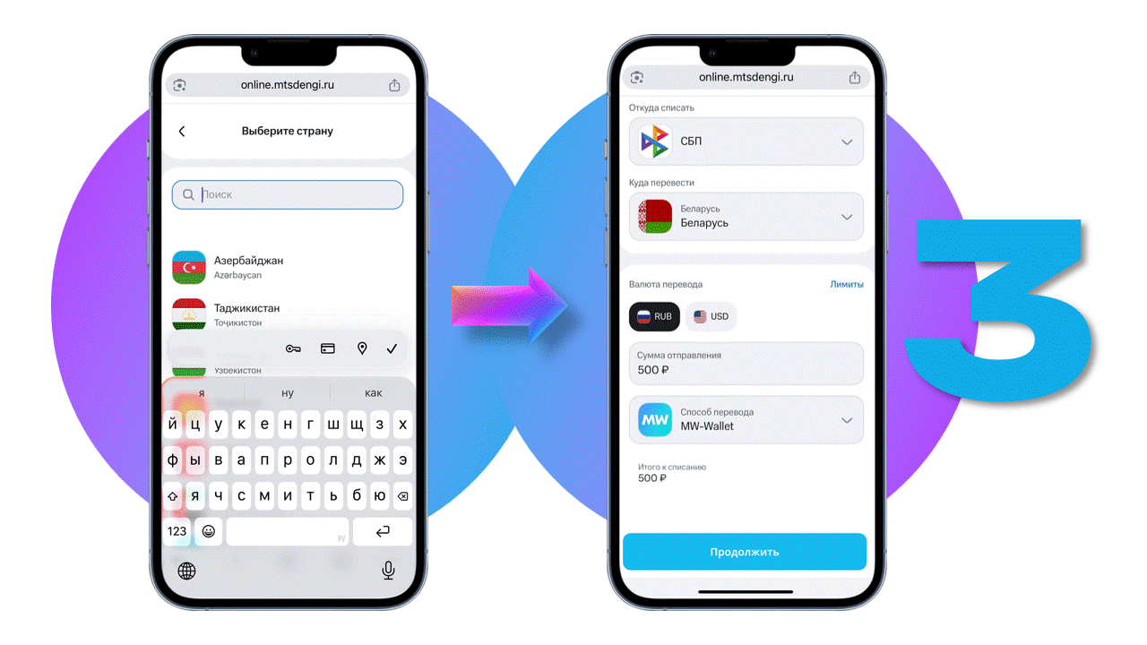 *Если MW-Wallet автоматически открывает приложение банка, перейдите на сайт https://online.mtsdengi.ru, войдите в свой аккаунт, выберите Платежи - Перевод за рубеж и следуйте инструкции.