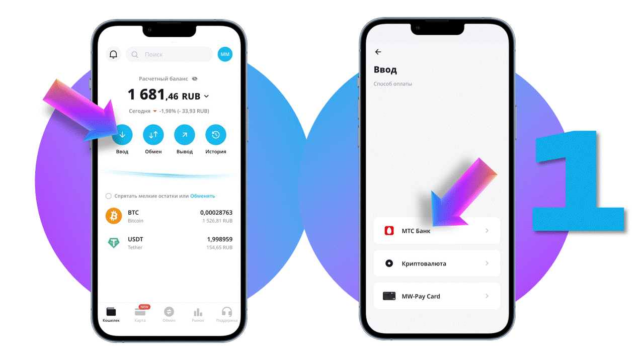 Основной способ пополнения кошелька в MW-Wallet - рублями с карты МТС Банка. Этот способ используется как для идентификации аккаунта после прохождения регистрации при первом использовании приложения, так и для быстрого ввода рублей на кошелек. ...