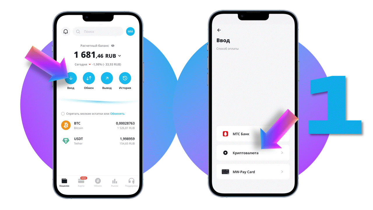 1. На главном экране приложения нажмите Ввод и выберите способ пополнения - Криптовалюта.