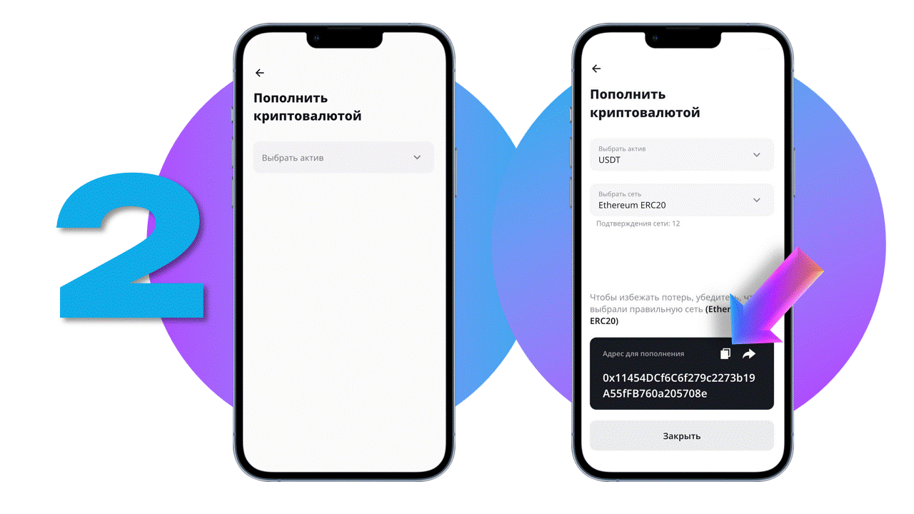 2. Выберите актив пополнения. Для USDT выберите также сеть.