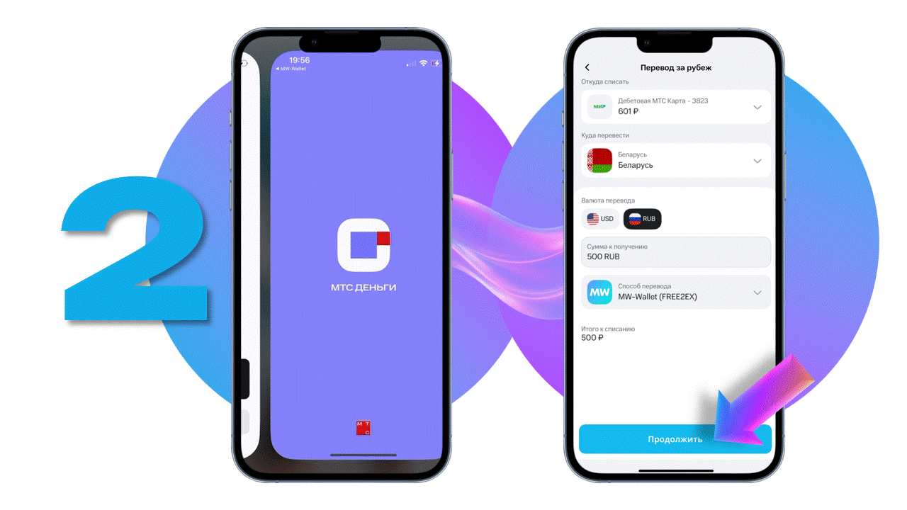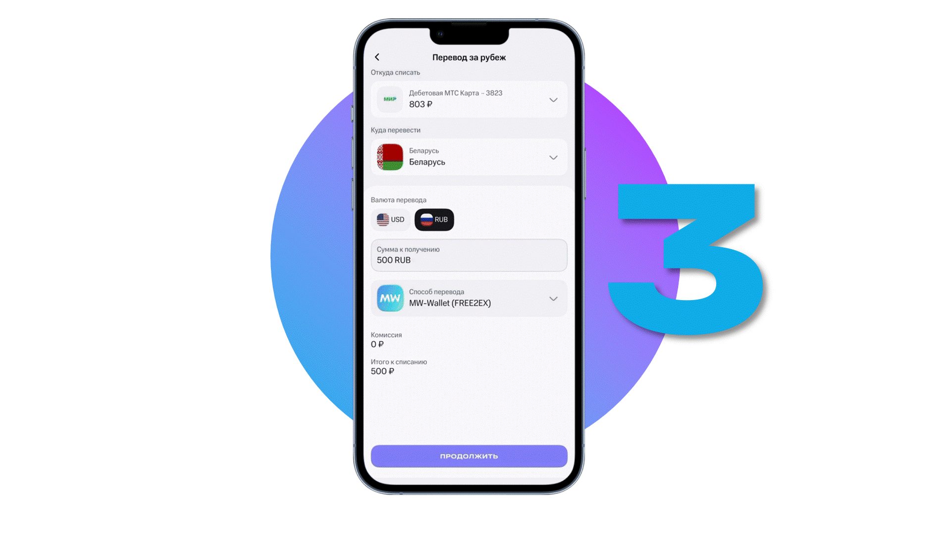 Выберите страну перевода - Беларусь; валюту перевода - RUB; способ перевода - MW-Wallet.