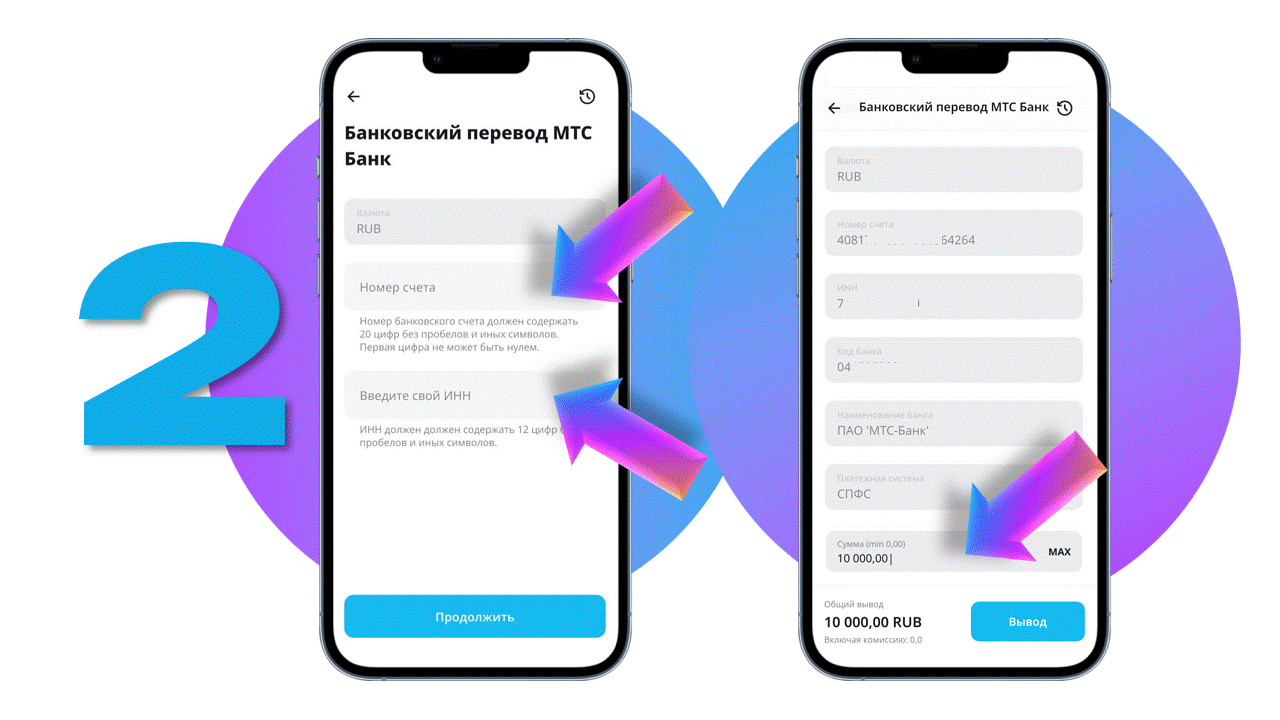 2. Валюта будет выбрана автоматически - RUB. Введите номер вашего счета в МТС Банке и укажите ваш ИНН.