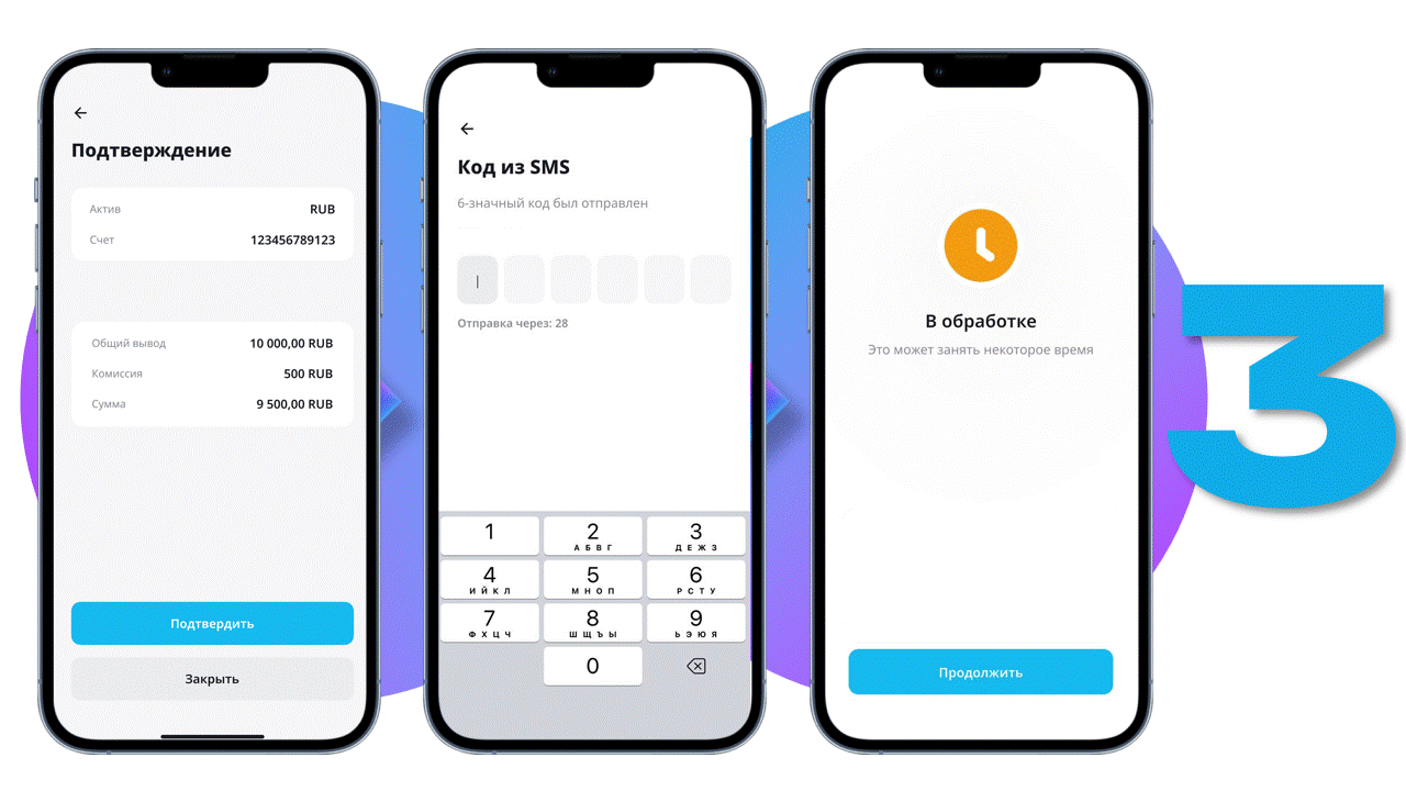 3. Проверьте данные, подтвердите вывод: введите 6-значный код подтверждения из СМС.